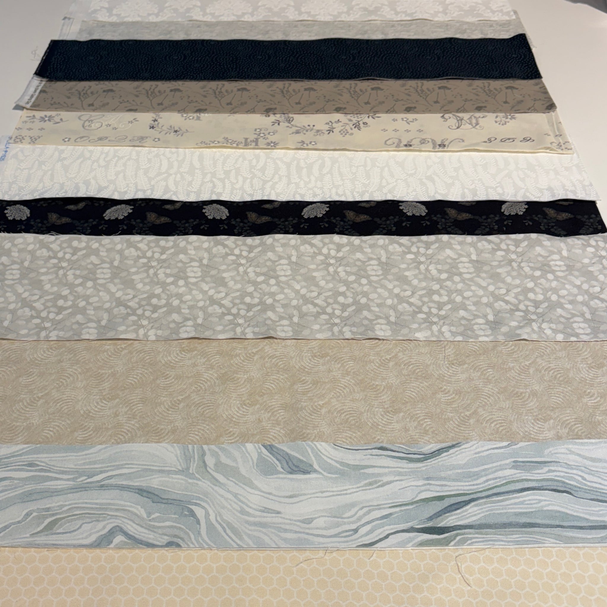 a pretty selection of assorted neutral fabric remnants (creams, greys, off-whites, blacks, taupes) in a cotton drawstring bag. each remnant bag is unique and is a mix of prints like stripes, florals, dots & solids
